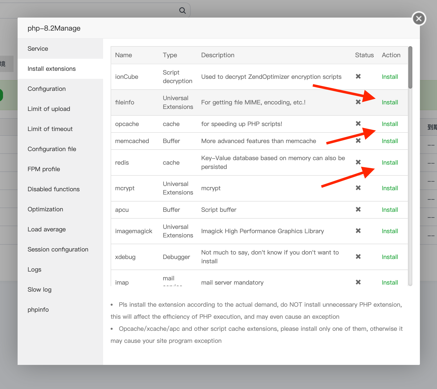 安装 fileinfo, opcache, redis, xload 扩展